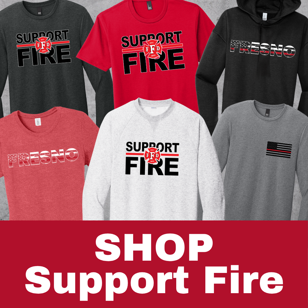 Our Support Fire merchandise in partnership with Fresno Fire Department features bold, modern designs that proudly honor our local heroes. With clean graphics, including the Fresno Fire badge and the iconic red line, each item—whether a tee, hoodie, or sweatshirt—is made for comfort, quality, and everyday wear. Perfect for showing your support for those who serve, this gear lets you stand with the community in style.